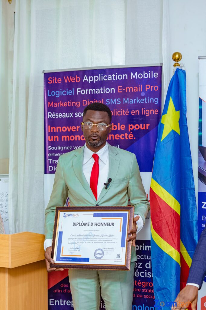 La cérémonie de remise des brevets a été marquée par un moment d’exception : la remise d’un Diplôme d’Honneur à Son Excellence Monsieur le Gouverneur Jacques KYABULA KATWE, Président du Conseil Provincial de l’Union Sacrée de la Nation – Haut-Katanga. Cette distinction honorifique a été décernée en reconnaissance de son soutien inestimable au développement et à l’inclusion numérique dans la province du Haut-Katanga. L’initiative de déployer des jeunes de Lubumbashi jusqu’à Kinshasa pour cette formation est une preuve concrète de sa vision et de son engagement à renforcer les capacités numériques de la jeunesse de sa province, préparant ainsi la voie à une ère de communication innovante et efficace.